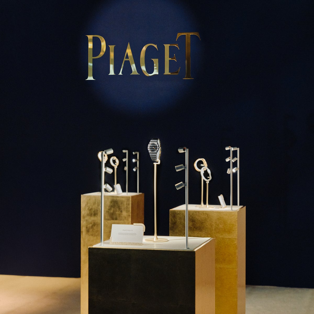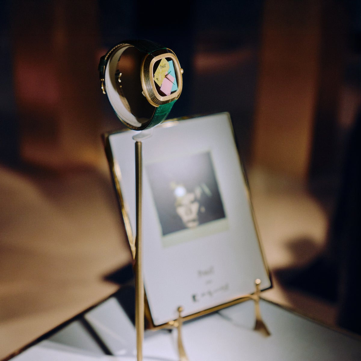 その旅は『AW Collage Stele』から始まり、アンディ・ウォーホル コラージュ リミテッド エディション ウォッチが披露されました。このクリエイションは、ピアジェの創業150周年を記念した新たなコラボレーションから生まれたものです。ウォーホルの最も有名なポラロイドコラージュの自画像のひとつから直接インスピレーションを得ており、彼が1973年に所有していたウォッチに敬意を表しています。隣には、かつてウォーホルが所有していた歴史あるピースがふたつ並び、彼の華やかな趣味と大胆さを彷彿とさせます。非常に奇抜な『Montre-Lingot』(Ref.9088)。そしてブラック タイの先駆けとなるRef.15102。そのダイヤルは、このアーティストが愛した「ポップなテレビ画面」を彷彿とさせます。今回のキュレーションは、最近の新解釈作品にも光を当てています。同じ展示台上に、アンディ・ウォーホル コレクションからのコンテンポラリーピースも並んでいます。アーティスト Gregor Hildebrandtの作品に直接インスピレーションを与えたタイガーズアイのダイヤルを持つウォッチ。そして同じコレクションからメテオライト文字盤が特徴的なウォッチです。ピアジェのシグネチャーのひとつであるこの特徴的なゴドロン装飾は、当然ながら、ピアジェを象徴するポロ コレクションのクリエイションにインスピレーションを与えました。ポロ コレクションは、アートオブリビング、ピアジェ ソサエティ、そしてジェットセットスピリットを称え、アンディ・ウォーホルのような著名人を惹きつけました。彼はこのスポーツ-リュクスのアイコンのスクエアモデルを所有していたのです。ピアジェ ポロはその大胆なデザインと、ケースとブレスレットの完璧な融合により、カジュアルエレガンス、そしてメゾンのウォッチメイキングの高い専門技術の象徴となりました。