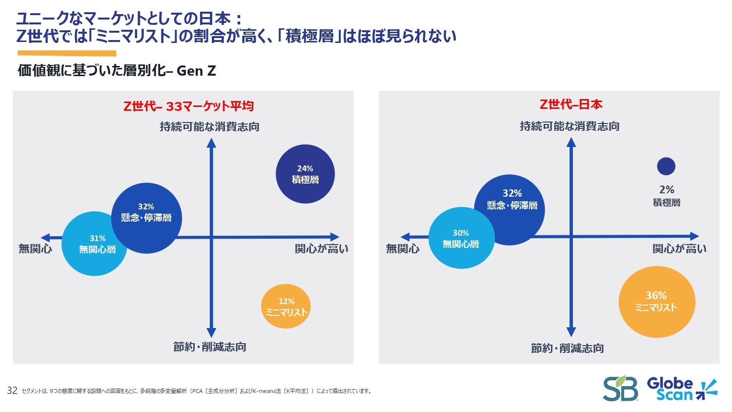 一方で、Z世代で最も多かったのは「ミニマリスト(Minimalists)」で36%を占めています。これはベビーブーマー世代(39%)に近い水準であり、日本の若年層のサステナブルな行動は、環境への配慮というよりも、経済合理性や「持たない暮らし」への志向によって動機づけられている可能性が高いと言えます。