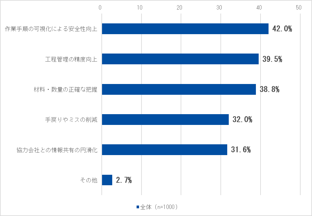 - 施工BIMの主なメリット(複数回答):1位作業手順の可視化による安全性向上42.0%、2位工程・作業効率41.9%、3位情報共有の円滑化44.0%、4位手戻り・ミスの削減32.0%。[調査3.]