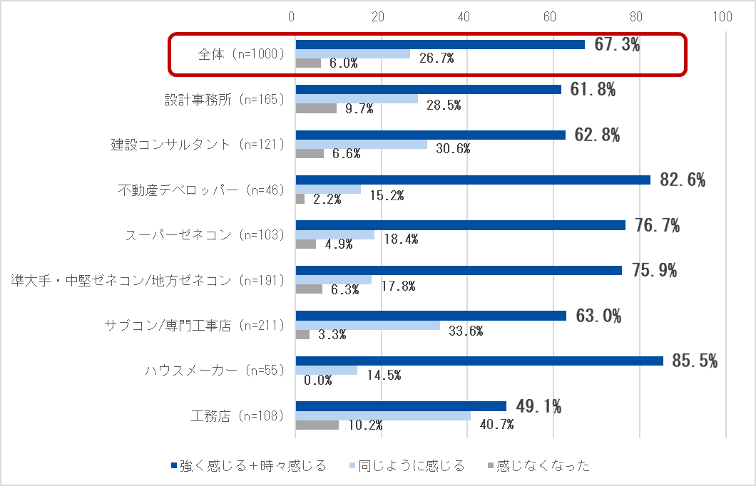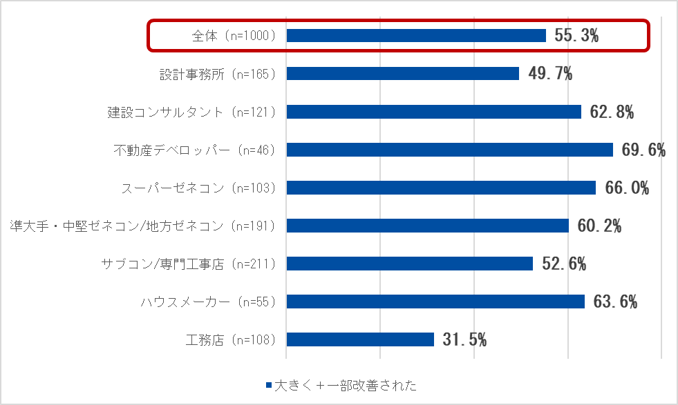- デジタル導入で「現場は改善する」60.7%(「大きく」10.0%+「ある程度」50.7%)。導入実感が高い層ほど改善実感が強い傾向。 [調査3.]