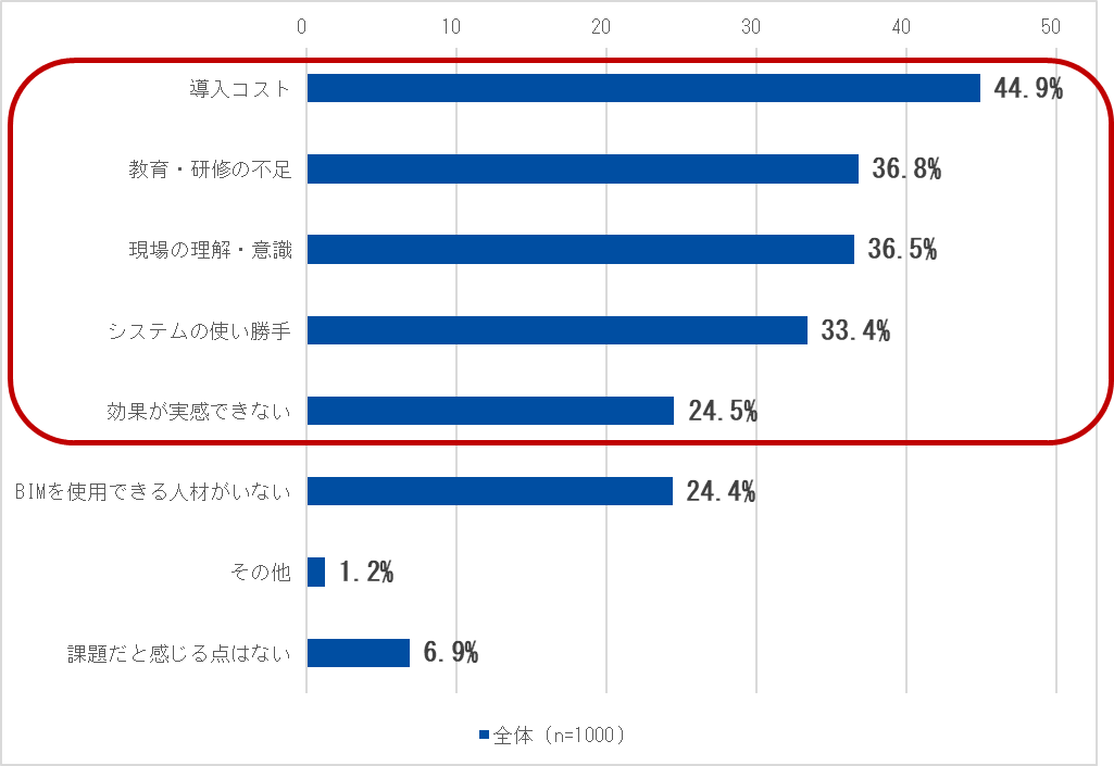 - BIM導入の課題(複数回答):1位導入コスト44.9%、2位教育・研修不足36.8%、3位現場の理解・意識36.5%、4位システムの使い勝手33.4%、5位効果が実感できない24.5%。活用が進むほど課題認識が具体化。 [調査3.]