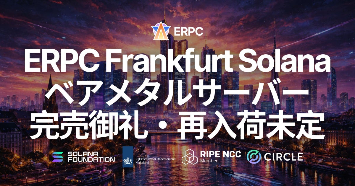 ELSOUL LABO B.V.(本社:オランダ・アムステルダム、代表取締役 CEO:川崎文武)および Validators DAO が運営する ERPC は、フランクフルト(FRA)リージョンにおいて提供してきた Solana アプリケーション向けベアメタルサーバー「SLV Metal APP+」ならびにプレミアムベアメタルサーバー「Metal Premium APP」「Metal Premium APP+」が完売したことをお知らせします。