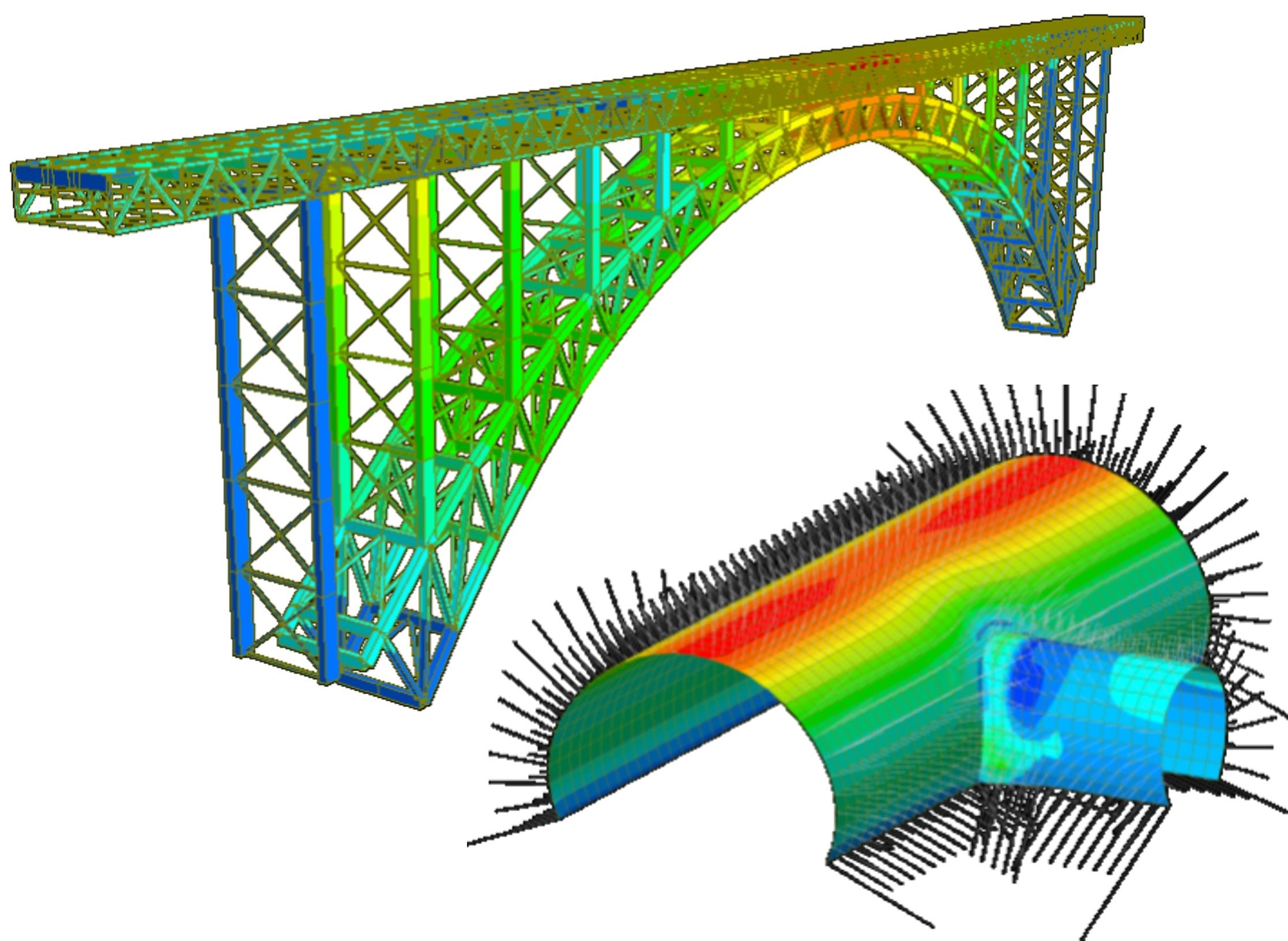 静的解析から非線形動的解析まで幅広く対応し、静的や動的の解析結果を用いて設計業務で活用することができます。これにより、従来のソフトウェアでは対応が難しかった特殊橋梁(下路式アーチ橋、トラス橋など)に対して上部と下部構造の同時照査をしたり、曲線橋やラーメン橋の耐震業務で活用するなど、橋梁エンジニアの皆様に新たな価値をご提供します。