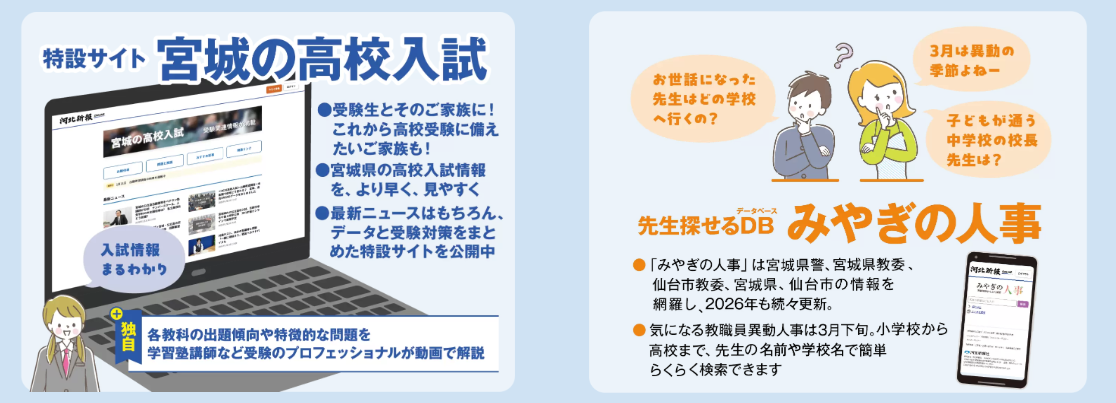 春は、新入学や新社会人のスタート、企業の決算や人事異動など、地域社会が大きく動く季節です。ニュースサイト「河北新報オンライン」では、こうした時期にニーズが高まる「宮城の高校入試」の詳報や、ビジネスに直結する「みやぎの人事」検索など、地元紙ならではの独自コンテンツを強化しています。