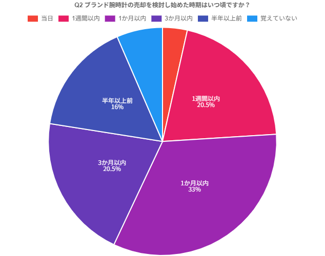 一方で「半年以上前」(16%)も一定数おり、売却は“衝動”だけではなく、資産整理やコレクション方針の見直しなど、中長期の検討を経て実行されるケースも存在します。“即決層”と“比較検討層”が併存している点は、サービス設計上の重要な示唆といえます。