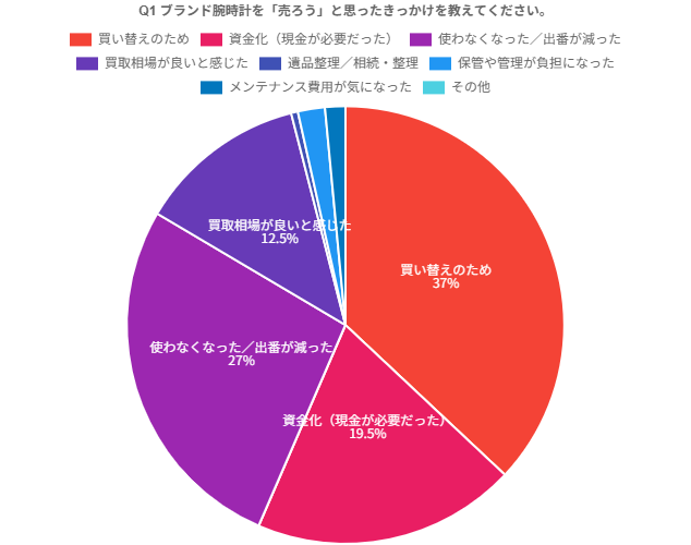 - 腕時計を「売ろう」と思ったきっかけは「買い替えのため」(37%)が最多。次いで「使わなくなった/出番が減った」(27%)、「資金化(現金が必要だった)」(19.5%)。
