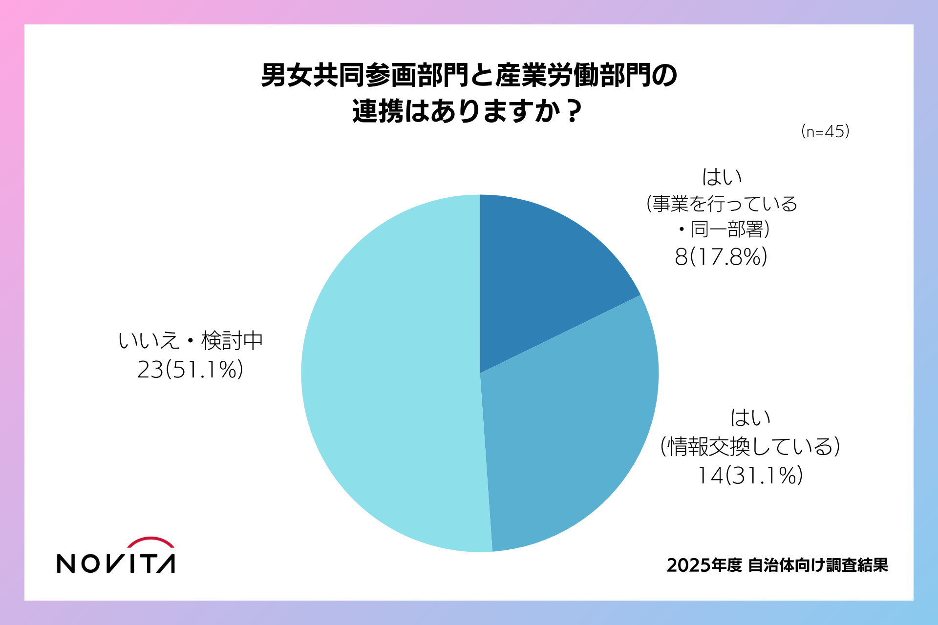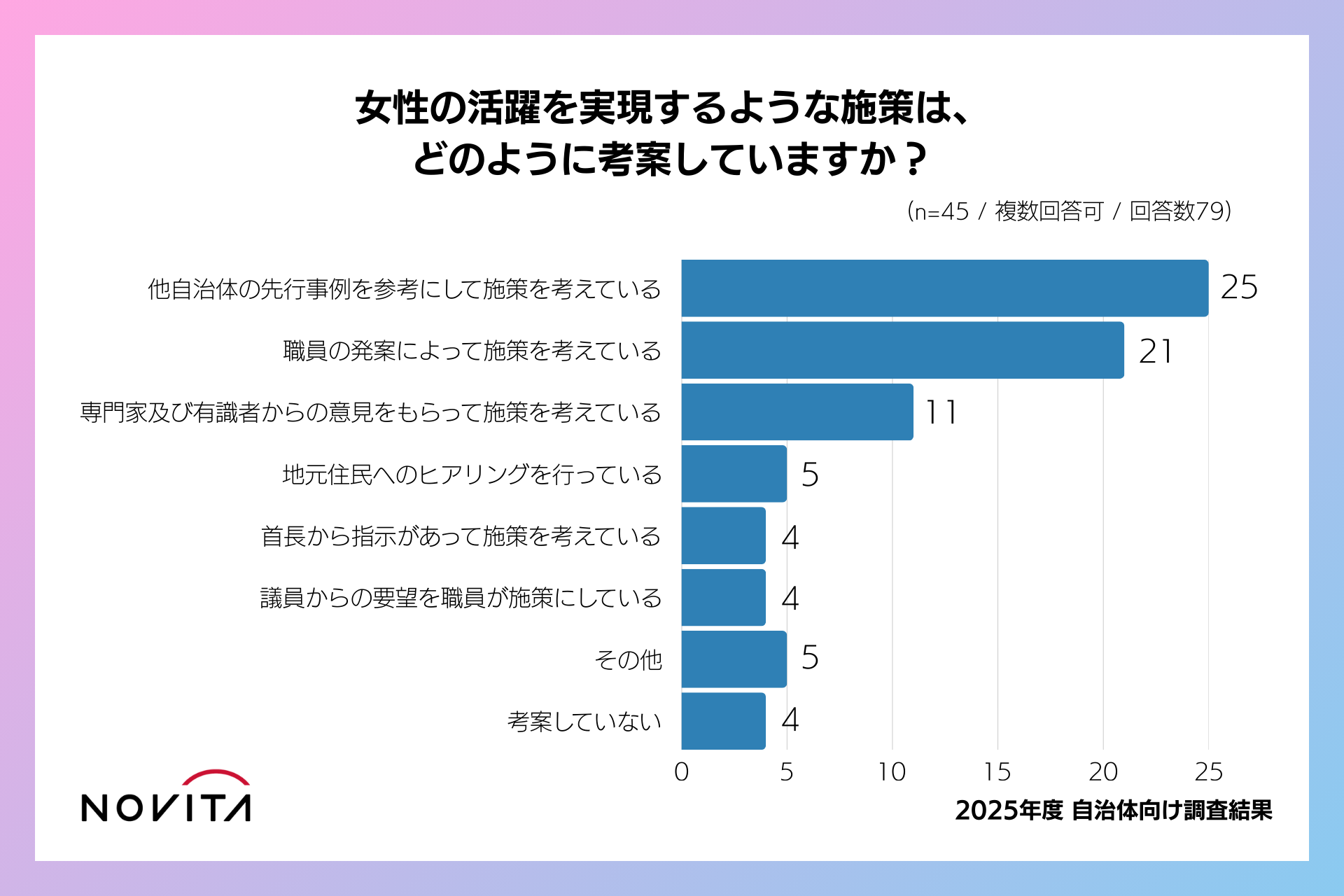 WebやICTを活用し、多様な働き方の実現を支援する地域共創事業などを行う株式会社ノヴィータ(所在地:東京都渋谷区、代表取締役:三好怜子、以下ノヴィータ、https://www.novitanet.com/ )は、全国の45自治体に向け、女性活躍支援や、男女共同参画の取り組みについて調査を実施しました。
