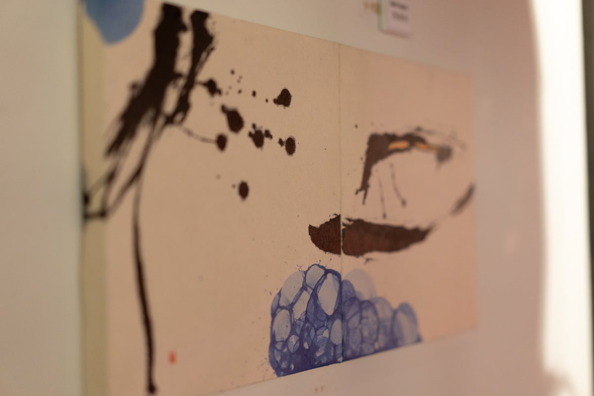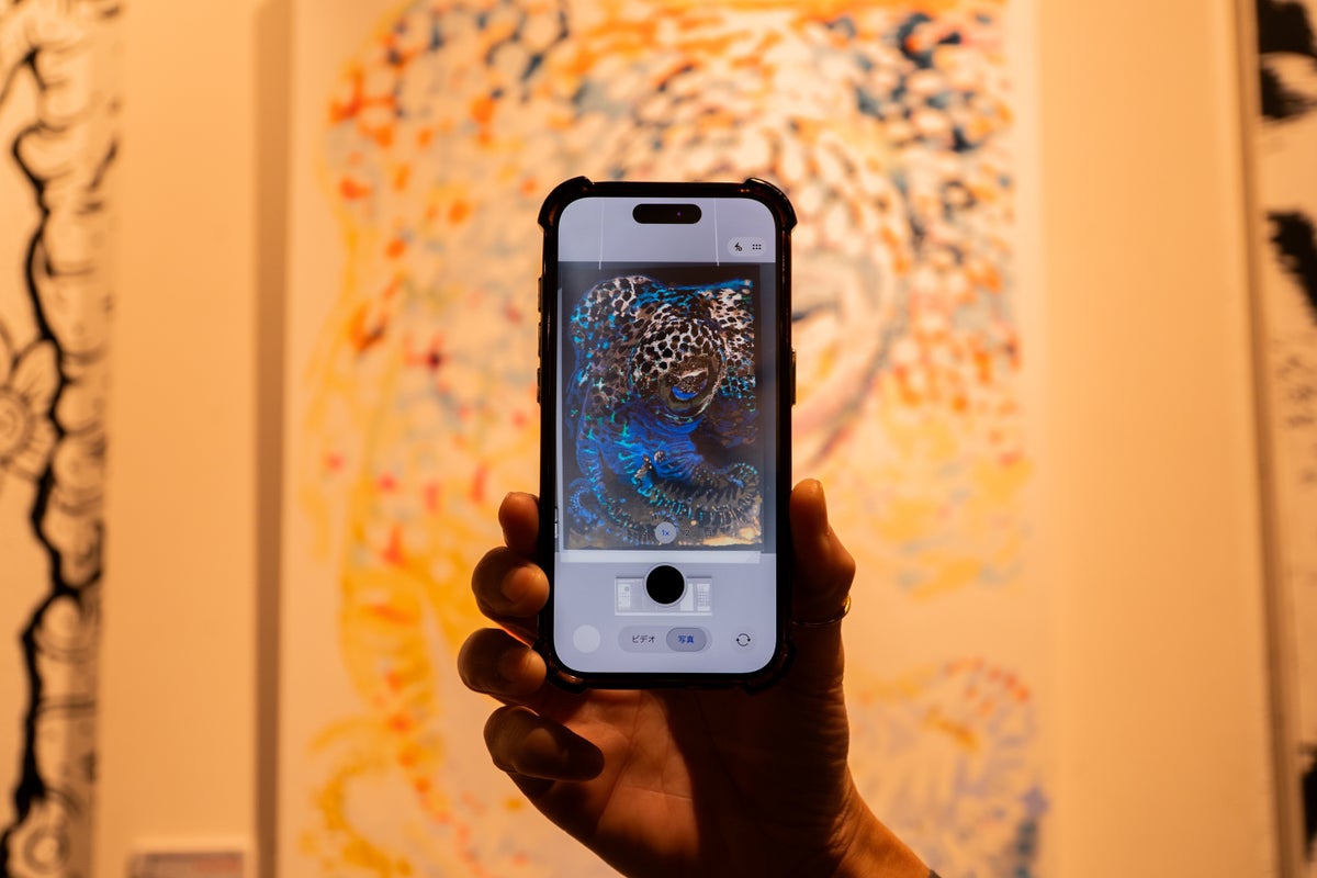 掛け軸、キャンバス、石灰岩(石板)の書アートなど多彩な展示の中でも、特に来場者の関心を集めたのが「色反転アート」。「石像」「生き物」をテーマにカメラ反転機能を活用し肉眼では見えない質感を引き出した作品です。ギャラリー内では、スマートフォンのカメラ越しに感嘆の声が上がりました。