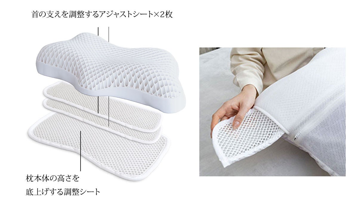 そこで、枕自体の形状と、首の支えを強化するための2種類の調整シートを組み合わせることで、ぷるぷるな質感はそのままに、しっかりと首を支える寝心地が生まれました。ひとつは枕本体の高さを底上げする調整シート、もうひとつは首の支えを調整するシート(2枚)で、首のサポート力を3段階で調整できます。これにより、個々の好みや体型に合わせた最適な寝心地を見つけやすくなっています。