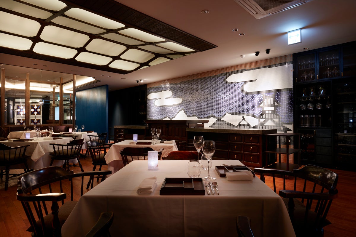 エントランスのステンドグラスと柚木沙弥郎氏デザインのモザイクタイルがお客様を迎えするレストランI;caza。“ながのテロワール”をコンセプトに信州の土地が生み出す素材に作らせてもらう料理を提供している。