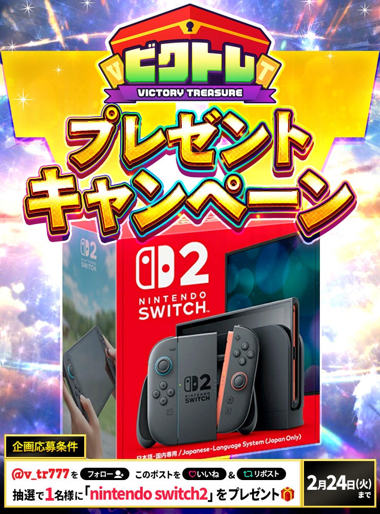 ビクトレの公式Xアカウントをフォロー&リポストいただいた方の中から抽選で1名様に「Nintendo Switch 2」をプレゼントいたします。詳細は公式Xをご確認ください。