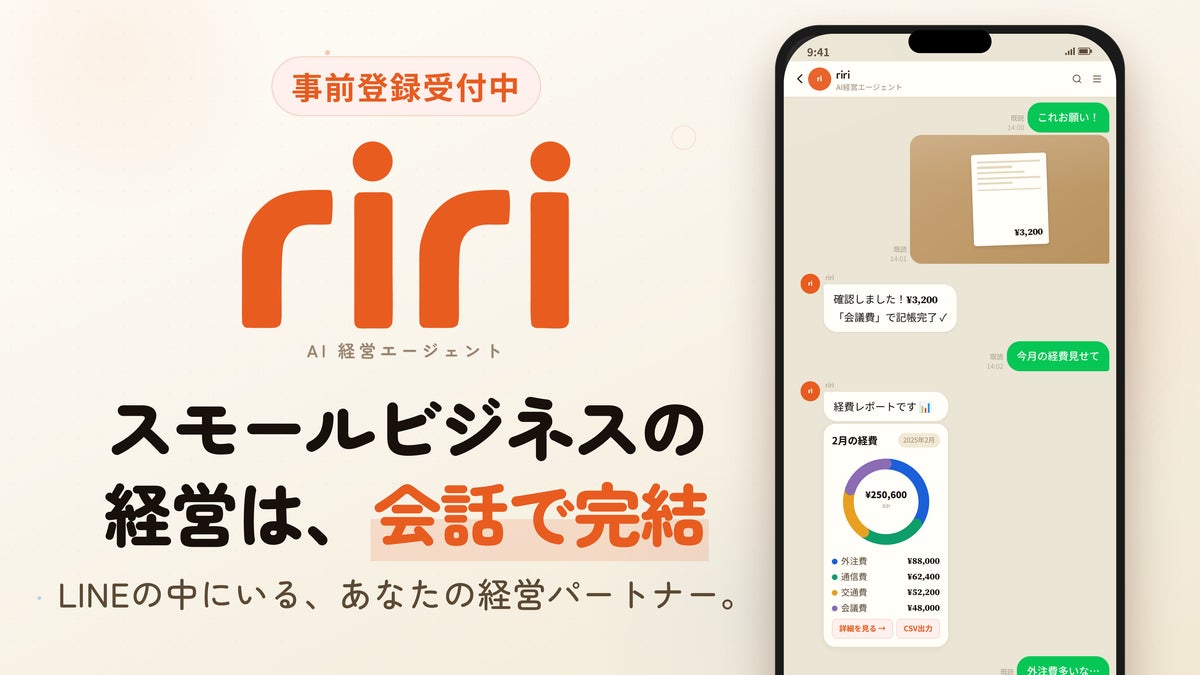 Nande株式会社(本社:東京都渋谷区、代表取締役:高師雅一)は本日、LINEで会話するだけで経理が完結するAI経営エージェント「riri(リリ)」の事前登録を開始しました。