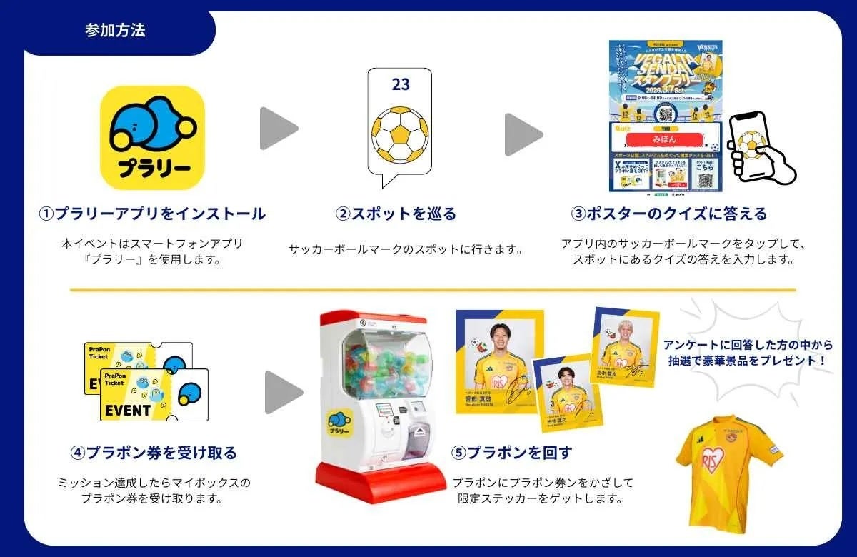 本企画は、明治安田J2・J3百年構想リーグ 地域リーグラウンド 第5節を、より楽しく回遊しながら満喫いただくためのデジタルスタンプラリー企画です。参加者は、ユアテックスタジアム仙台やその周辺の七北田公園に設置された対象スポット全15か所をめぐり、『プラリー』上でクイズに答えながらデジタルスタンプを獲得。複数スポットを巡るほどJリーグおよびベガルタ仙台の魅力により深く触れられる体験設計となっています。