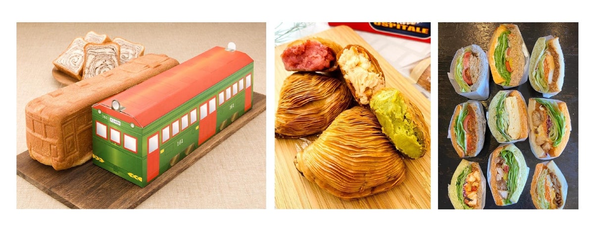 (写真左)堺ちん電パン「朝日製パン/堺市」、(写真中)スフォリアテッラ「オスピターレ/福岡県」、(写真右)サンドイッチ「ブーランジェリー餡1999/川西市」