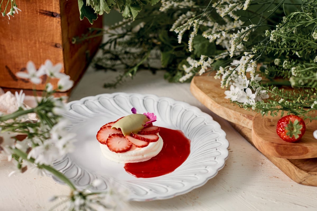 香り高く甘酸っぱい苺の魅力を引き立てる繊細なデセールに、濃厚で香ばしいピスタチオのコクを重ね、ブランマンジェからパブロヴァまで美しく仕立てました。
