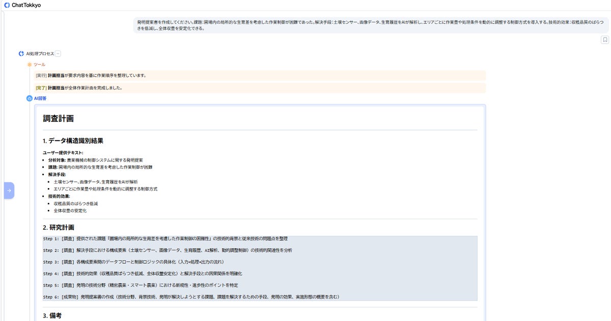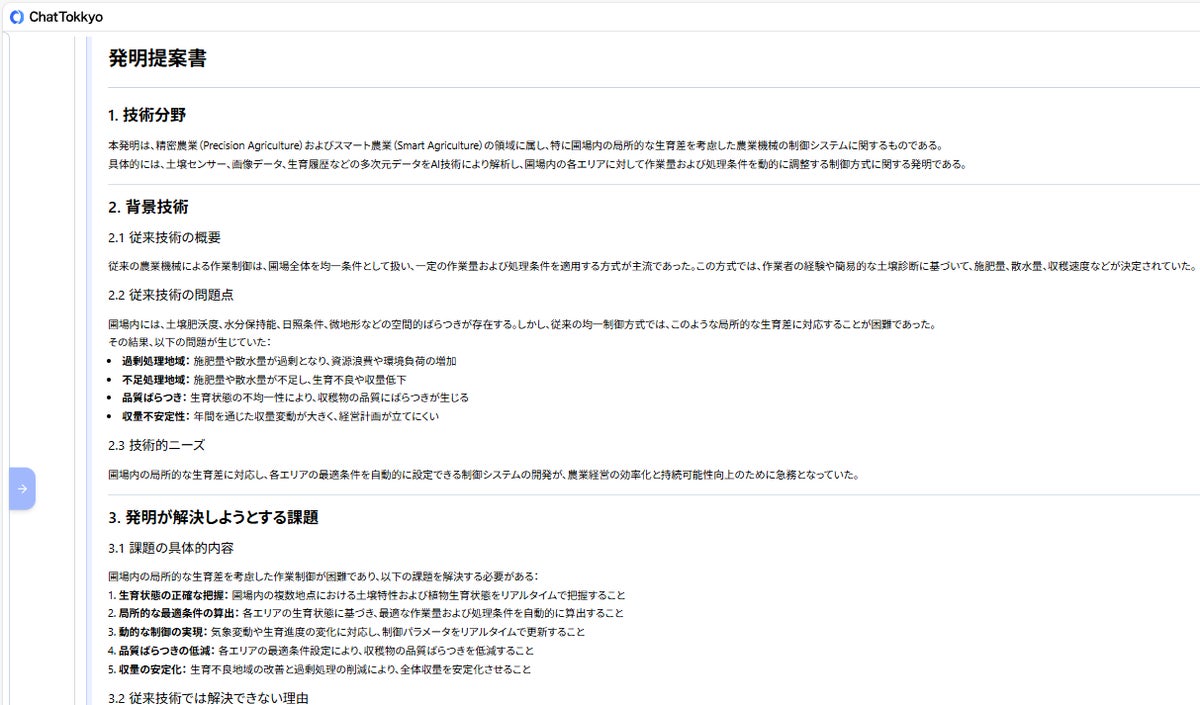 MyTokkyo.Aiは、圃場管理データや制御ロジックの説明資料、生育管理に関するメモなどを入力することで、AIが内容を解析し、「課題」「解決手段」「技術的効果」の観点から発明要素を自動的に整理できる。また、農業機械や環境制御分野の先行技術を参照しながら検討を進められる点も評価された。