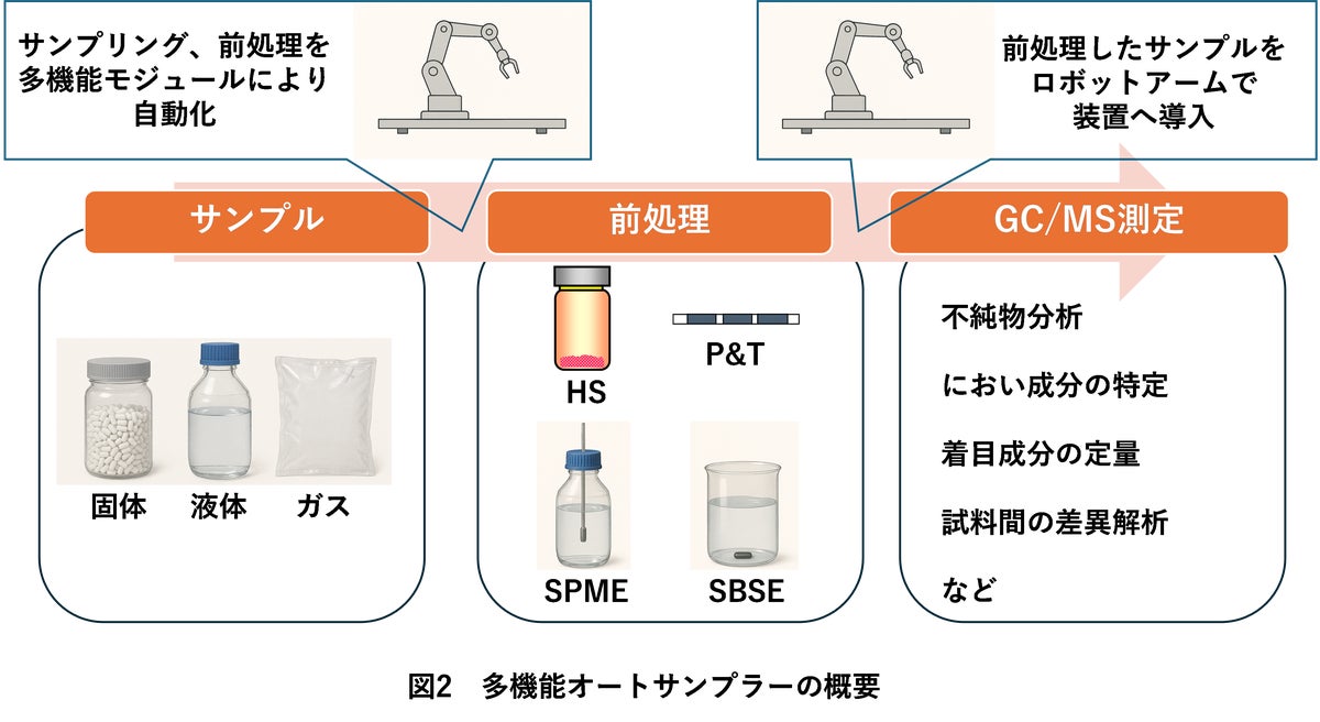 多機能オートサンプラーの概要を図2に示します。液体・固体・気体など、多様な試料形態に対応し、直接導入や濃縮分析など複数の試料導入方法を選択できる多機能モジュールを搭載しています。ロボットアームが自動的に多機能モジュールを交換し測定するため、加熱時のアウトガス分析や臭気分析など、多様な前処理・測定を一元化でき、高速かつ高精度で再現性の高い分析結果がご提供可能になりました。
