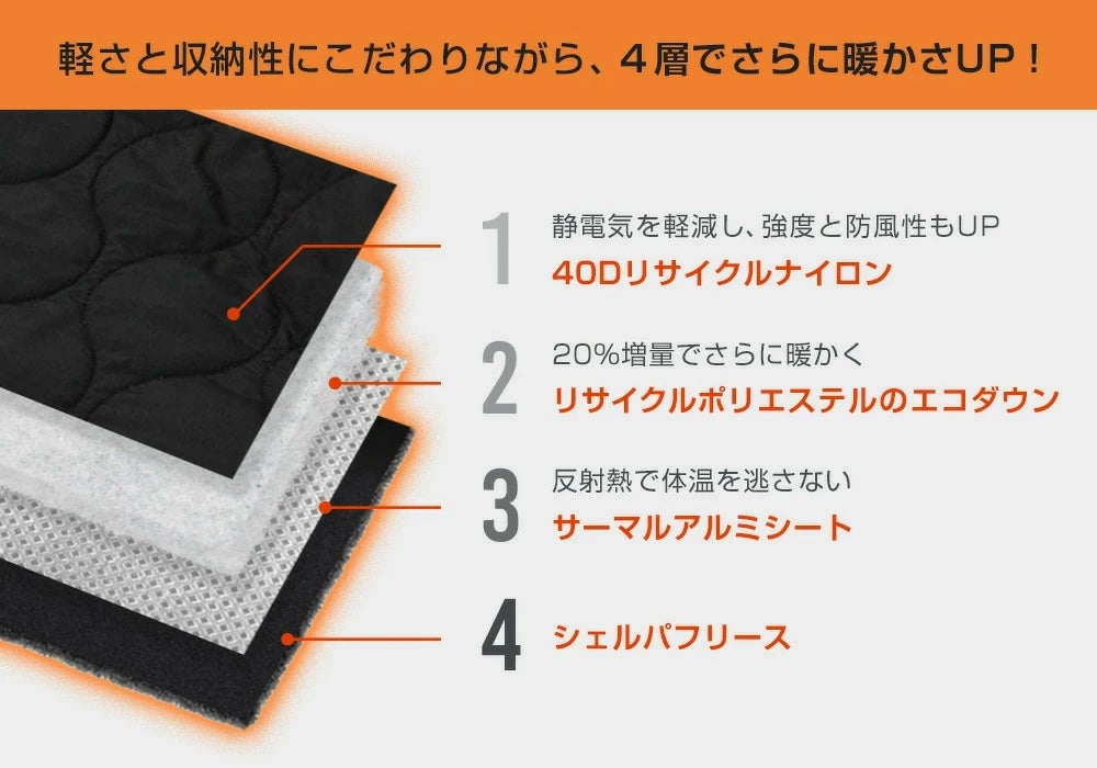 また、表面素材を20Dポリエステルから40Dナイロンへ変更。これにより、冬場に気になる静電気の軽減に加え、防風性・耐久性も向上しています。従来同様、廃棄されたペットボトルを再利用したリサイクル素材(ナイロン/ポリエステル)を採用し、環境にも配慮した設計となっています。