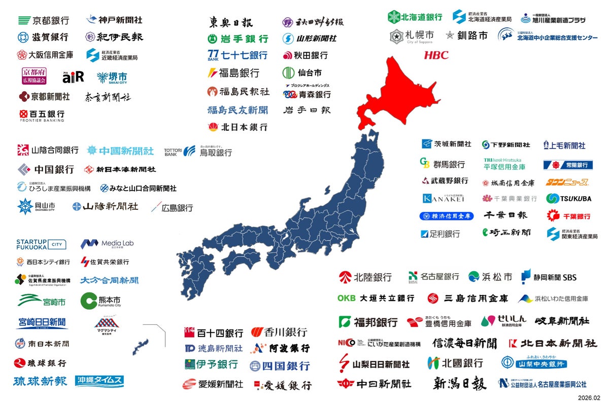 「PR TIMES」は、地方地域発の情報流通を目指し、全国各地域に根差す金融機関やメディア・自治体と提携を進めています。本協定の締結により、当社が地域企業や自治体等団体と地方情報流通に向けて結んだアライアンスは全国47都道府県で100例以上に拡大するに至りました(地方金融機関43例(35行・8信金)、地方メディア39社、官公庁・自治体等1道1府3県13市4機関の合計104例)。