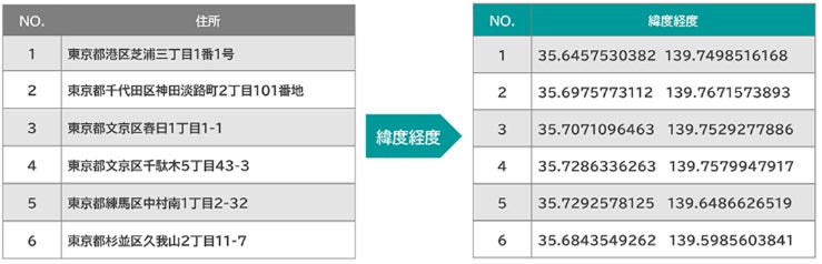 ▲緯度・経度の付与イメージ 保有する住所データに対し、緯度・経度を付与し、正確な位置情報の特定をします。