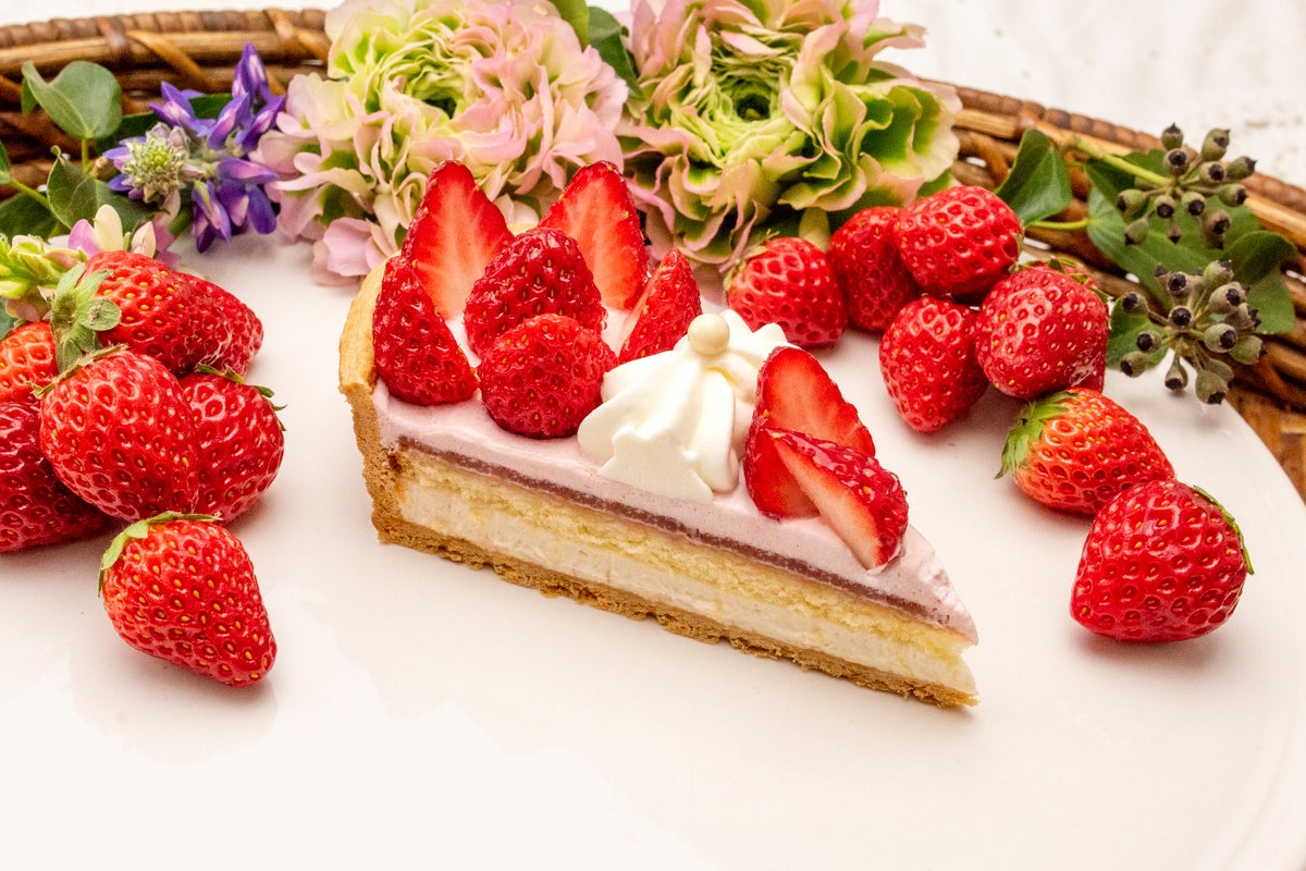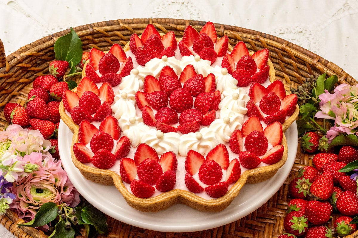サクサクの生地に、チーズのスフレと“ル ガール”クリームチーズを使用したレアチーズムースとベリージャムを重ね、イチゴを一面に飾りました。オレンジゼストとドライイチゴ、コーンフラワー(矢車菊)をあしらい、ブーケをイメージした華やかなタルトに仕立てました。ホワイトデーの贈り物にもぴったりです。