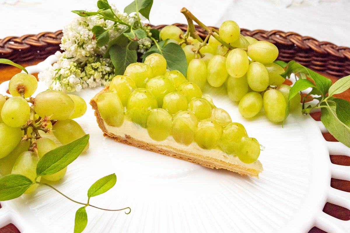 皮が薄くサクサクとした食感と、ジューシーで甘酸っぱい味わいが特徴のトンプソンをタルト一面に飾り、さっぱりとしたサワークリームとカスタードクリームをあわせました。