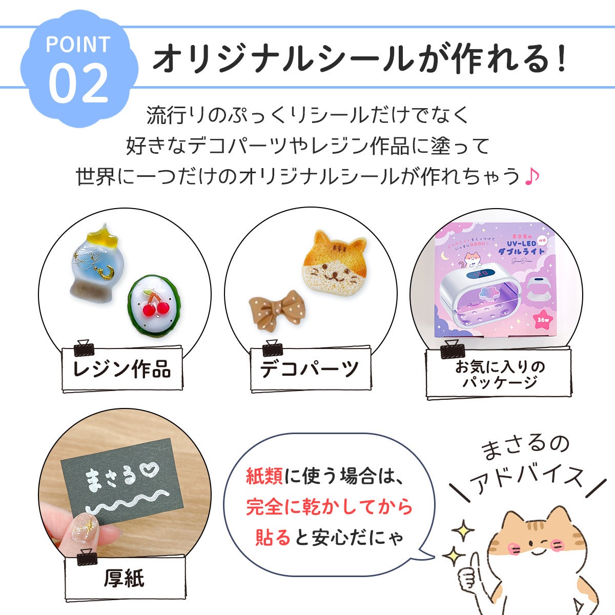 2、オリジナルシールが作れる!流行りのぷっくりシールだけではなく、好きなデコパーツやレジン作品に塗って世界に一つだけのオリジナルシールが作れちゃう♪