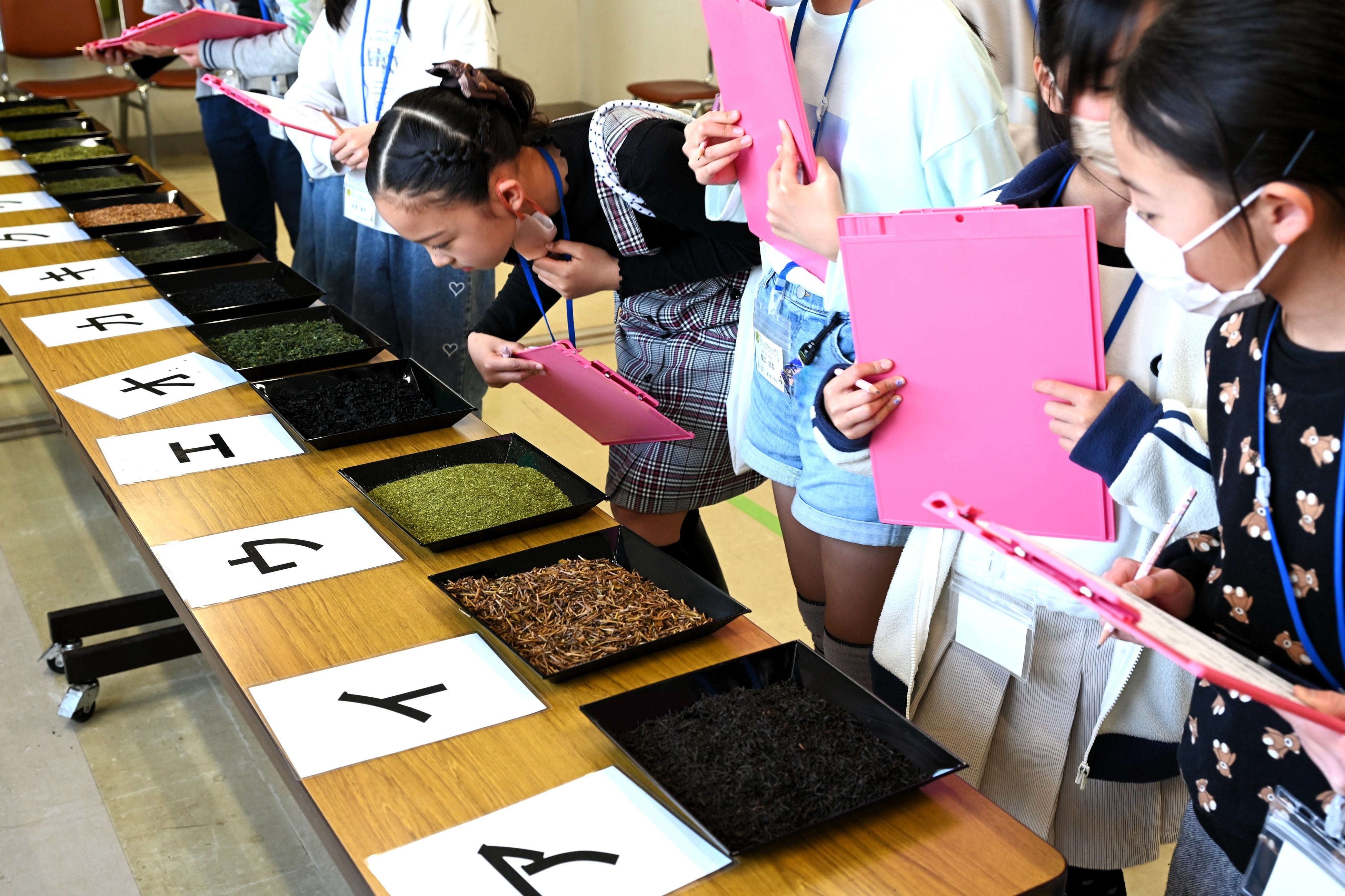 茶葉の外観、香りだけでお茶の種類を当てる競技。ソムリエさながらに茶葉を見つめ、香りをかぐ子どもたちの真剣な表情は、本大会ならではの光景です。