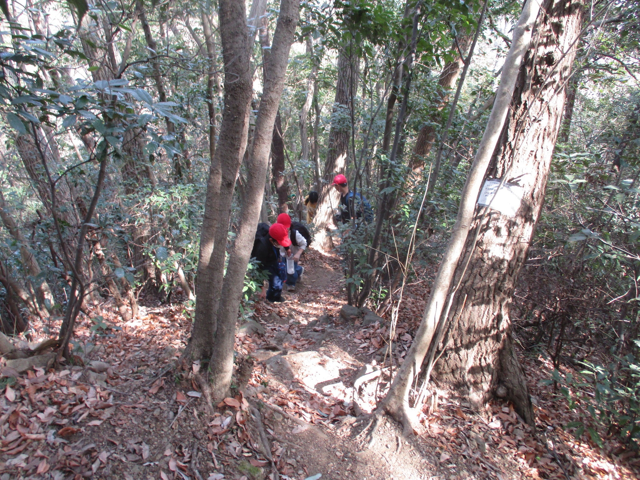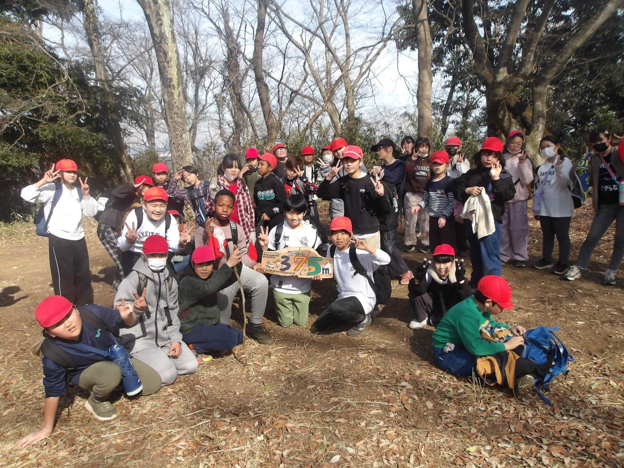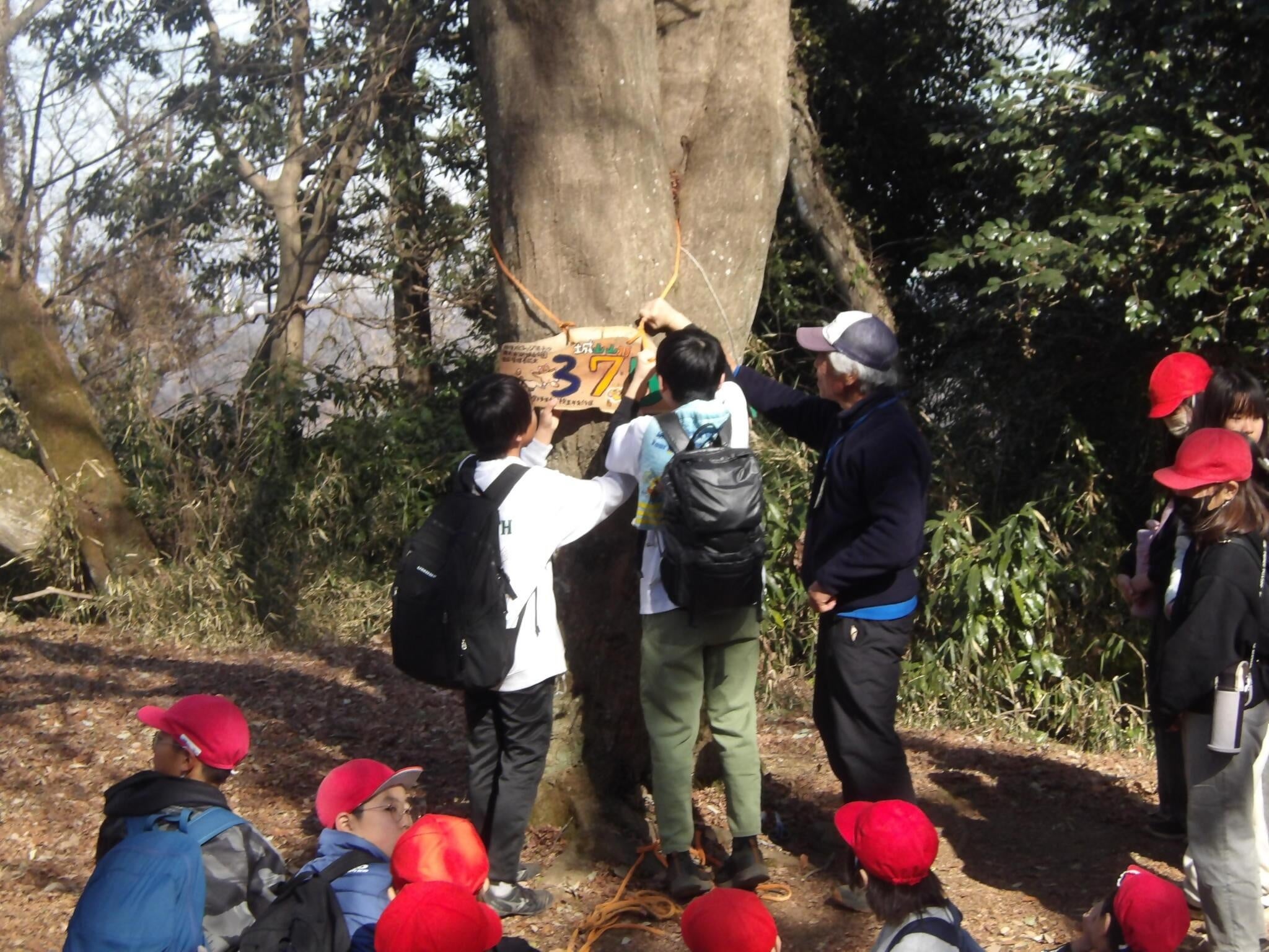 山頂標識の設置は令和8年2月5日(木)に行われました。当日は児童が標識を背負って山頂を目指し、山頂では代表の児童が標識を楓の木にロープでくくりつけ、設置が完了となりました。自分たちで作った看板が山頂に設置され、学年みんなで喜ぶとともに、達成感を味わいました。