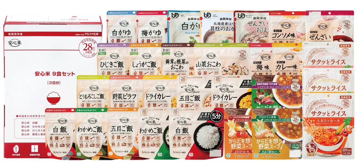 こうした状況を背景に、アルファー食品株式会社(本社:島根県出雲市大社町北荒木645番地、代表取締役:林 隆史、以下「アルファー食品」)は、家庭に限らず、企業や自治体、施設など社会全体の防災備蓄を見据えた長期保存食シリーズを展開しています。賞味期限は5年~7年。ご飯(アルファ化米)を中心に、おこげ、レトルトのおかゆやスープなど約30種類を取り揃え、非常時でも「誰もが食べられる」ことを諦めない備えを提案しています。