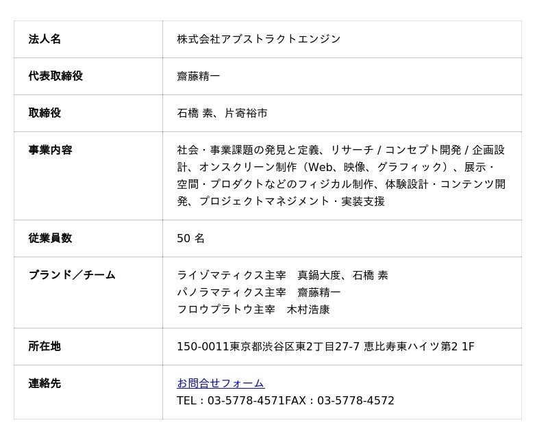 株式会社アブストラクトエンジンと株式会社フロウプラトウ(ともに本社:東京都渋谷区、代表 齋藤精一)は2026年1月1日に組織再編を行い、株式会社アブストラクトエンジンに統合、このたびクリエイティブエージェンシーとして新体制へ移行することになりました。