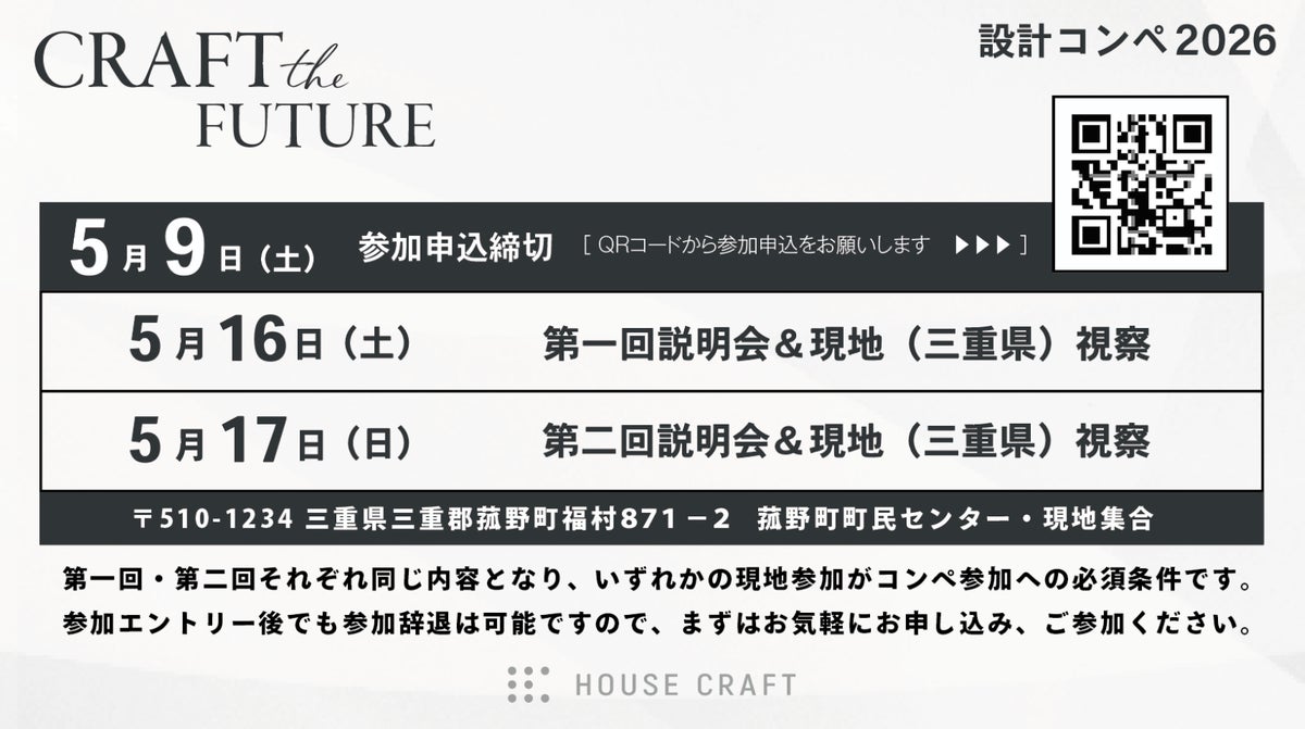 コンペティション詳細については主催ハウスクラフト「コンペお知らせ」ページ●参加対象 : 三重県での現地視察や名古屋市内での最終審査に無理なく参加可能な建築系学生(大学生・専門学校生・高校建築科の学生)。 個人、またはチームでの応募が可能です。