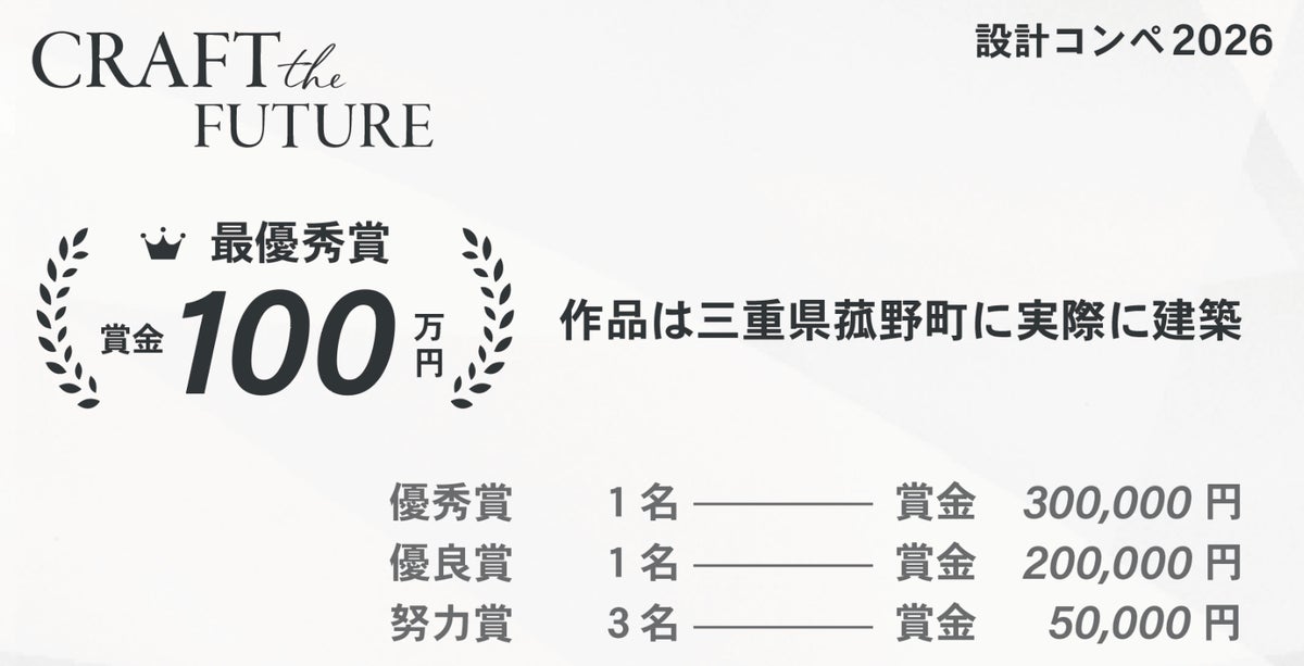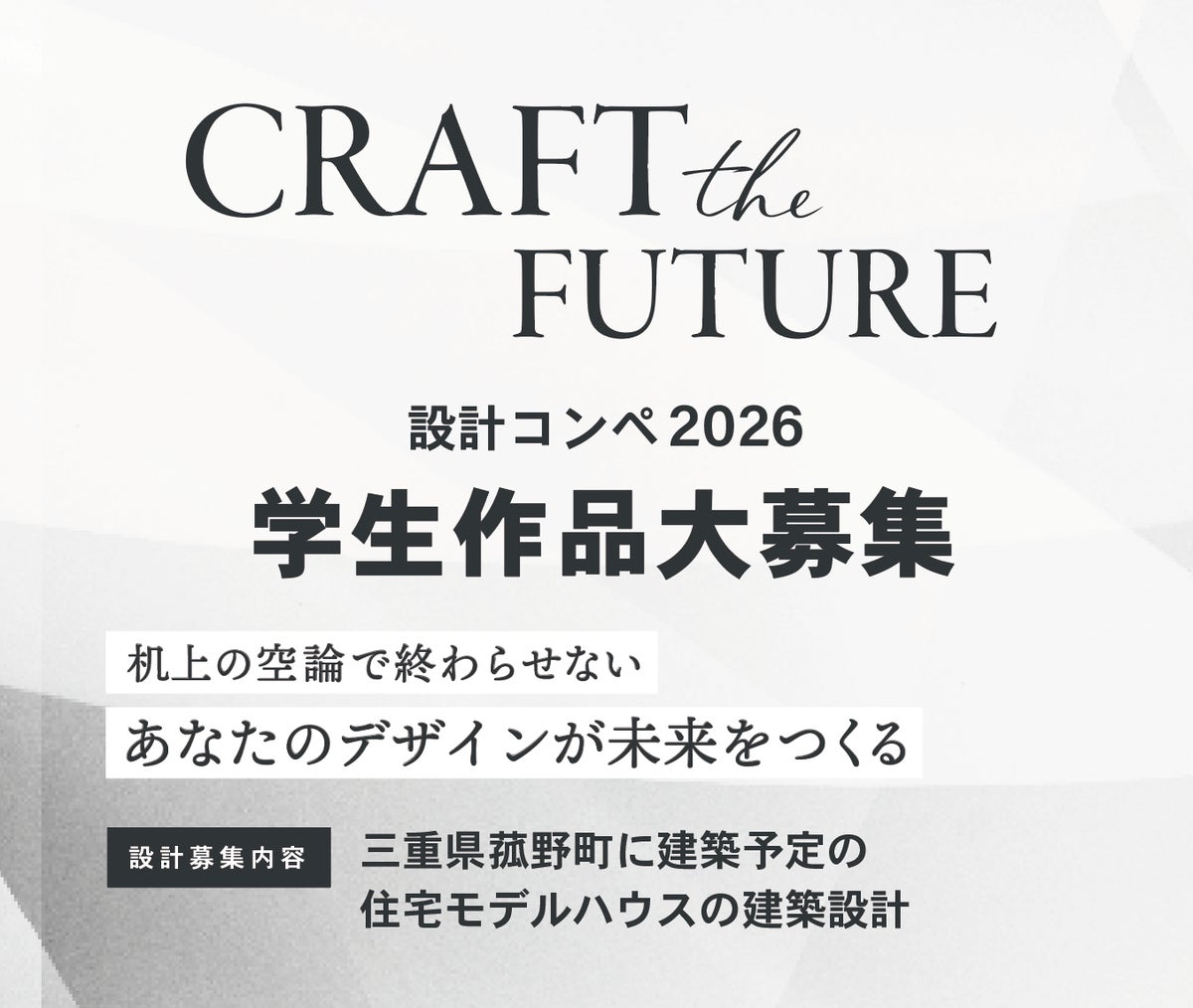 三重県を中心に注文住宅の設計・施工を手がけるハウスクラフト株式会社(本社:三重県三重郡菰野町、代表取締役社長:遠藤 真二)は、建築を志す全国の学生を対象とした実践型設計コンペティション『第一回Craft the Future ~学生設計コンペ 2026 in 東海~』を開催いたします。 本コンペの最大の特徴は、最優秀賞(賞金100万円)に選ばれた作品が、三重県菰野町に実際のモデルハウスとして建築される点です。
