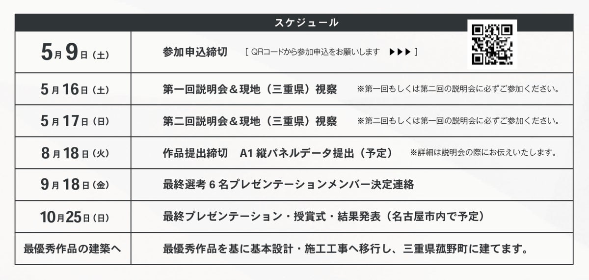 コンペに参加の必須条件は、「三重県菰野町で開催される第一回もしくは第二回の説明会&現地視察にリアル参加」になります。エントリーされて、説明会参加後でも途中辞退は可能です。まずは、お気軽にエントリーと、説明会参加をお願いいたします。こちらの参加エントリーフォームからエントリー願います。