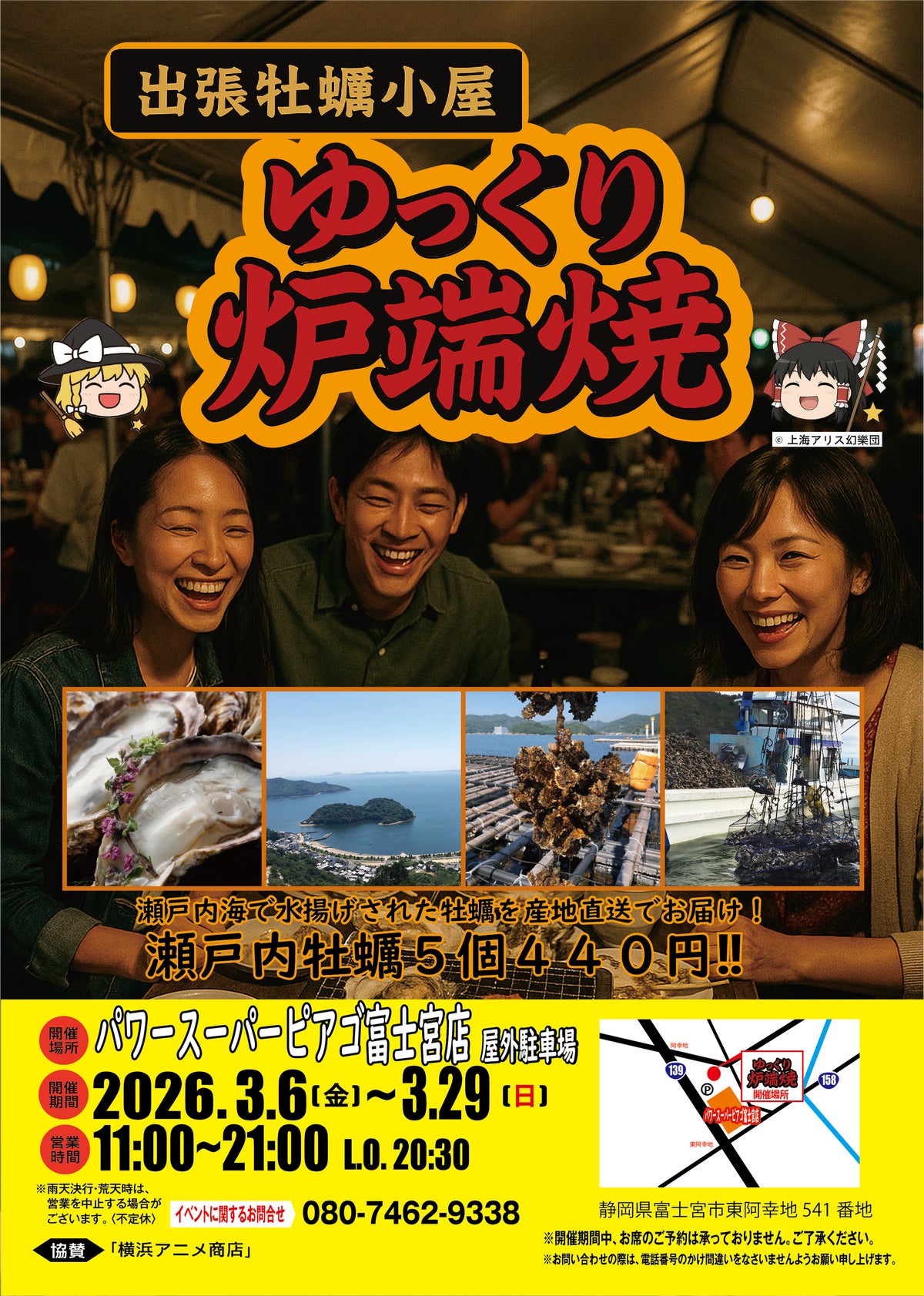 瀬戸内産牡蠣、 赤穂産牡蠣、 石巻産牡蠣など各地で水揚げされた牡蠣を産地直送でお届け!! ゆっくり炉端焼き実行委員会 (080-7462-9338) 3月6日、 ピアゴ富士宮 屋外駐車場 特設会場 (静岡県富士宮市) にて期間限定オープン。 開催期間は、 3月6日 (金) から3月29日 (日)