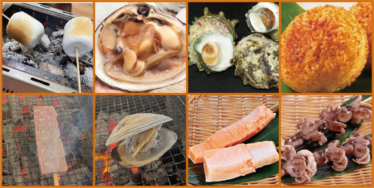 海鮮・お肉・ごはん・お菓子など30種類を超える豊富なメニューをご用意しています。 中でも、 能登半島産のサザエ・房総半島産のホンビノス貝・青森産の北寄貝など味と産地にこだわった 厳選食品を炭火で食べることが出来ます。