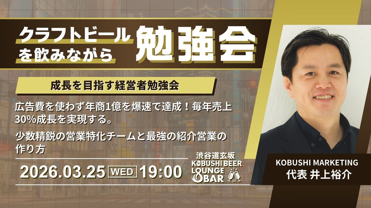 渋谷のマーケター&起業家コミュニティを運営するKOBUSHI MARKETING合同会社(東京都渋谷区、代表:井上裕介)は、2026年3月25日(水)19:00~広告費を使わず毎年売上30%成長を実現したマーケノウハウの勉強会を開催すると発表した。