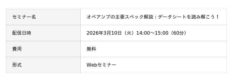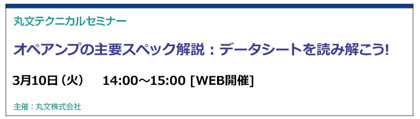 エレクトロニクス商社の丸文株式会社(代表取締役社長 兼 CEO / COO︓堀越裕史、本社: 東京都中央区、以下、丸文)は、3月10日(火)にアナログ設計の成功を左右するオペアンプの主要スペックを解説する無料のオンラインセミナーを開催します。