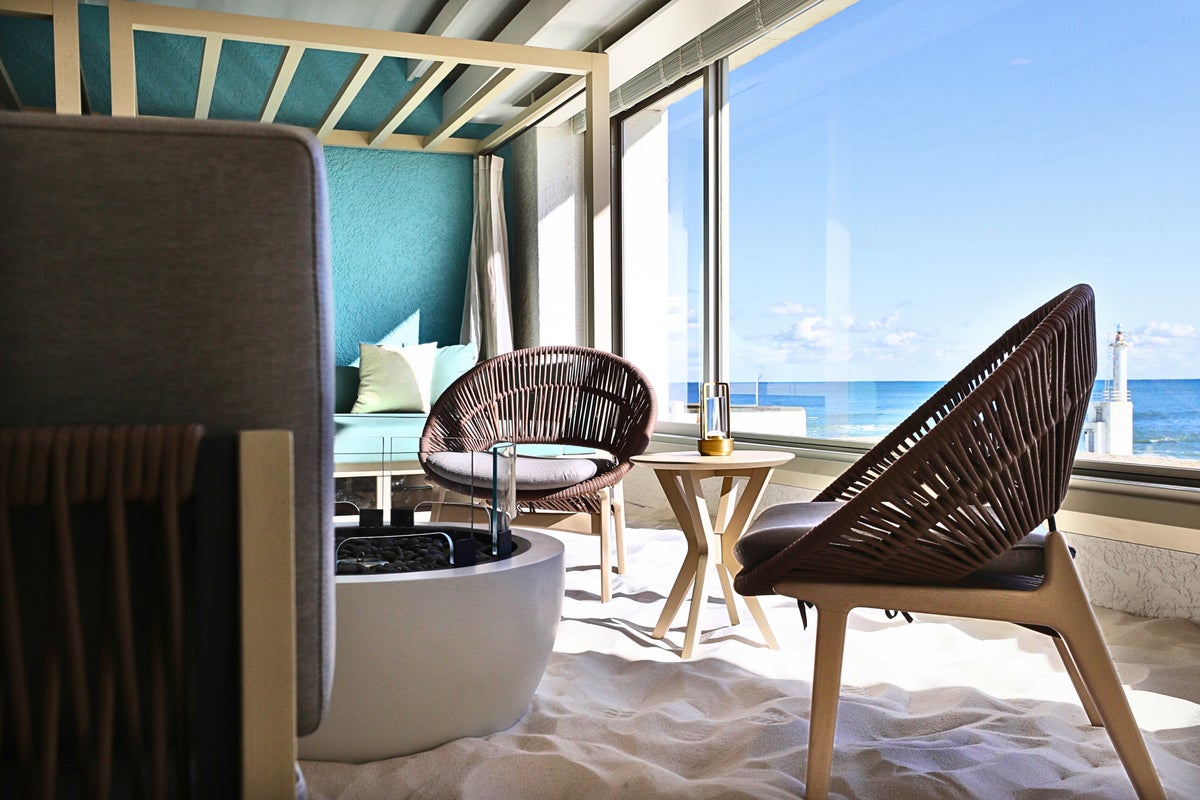 足元には白い砂が広がり、まるでビーチにいるような感覚でくつろげる「ビーチラウンジ」。開放感のある窓からは、時間帯によって異なる海の表情を楽しめます。昼は海を眺めゆったりと、夕暮れも幻想的な雰囲気でドリンク各種をお楽しみいただけます。