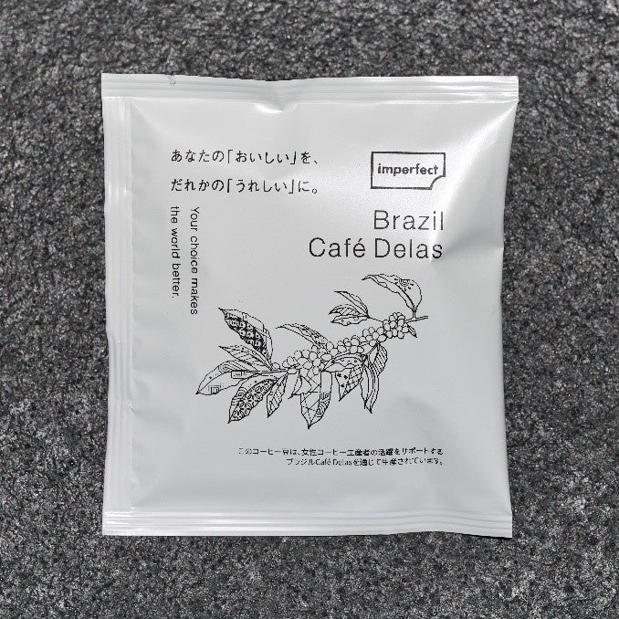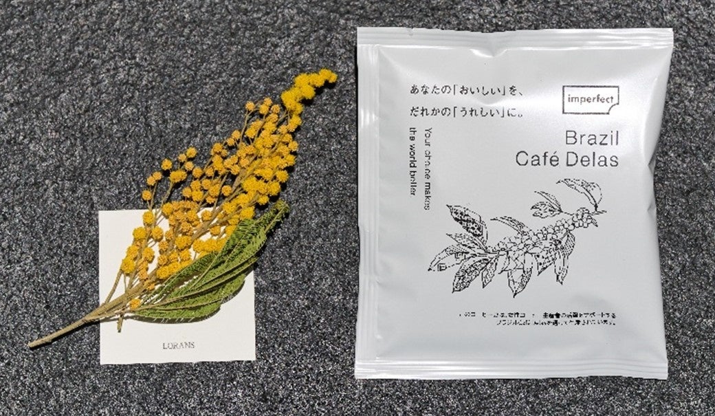 店舗オープンを記念して配布するギフトには3月8日の国際女性デーにあわせて、併設するフラワーショップ「LORANS」のミモザと、Cafe Delasのコーヒー豆を使用したimperfectの限定ドリップバッグコーヒーをご用意しております。Cafe Delasは女性が主体で経営するコーヒー農園をサポートする団体であり、imperfectでは、2020年、2022年にお客さまからの投票で選ばれた「ブラジルのコーヒー産業に従事する女性をサポートする取り組み」を共に推進しています。