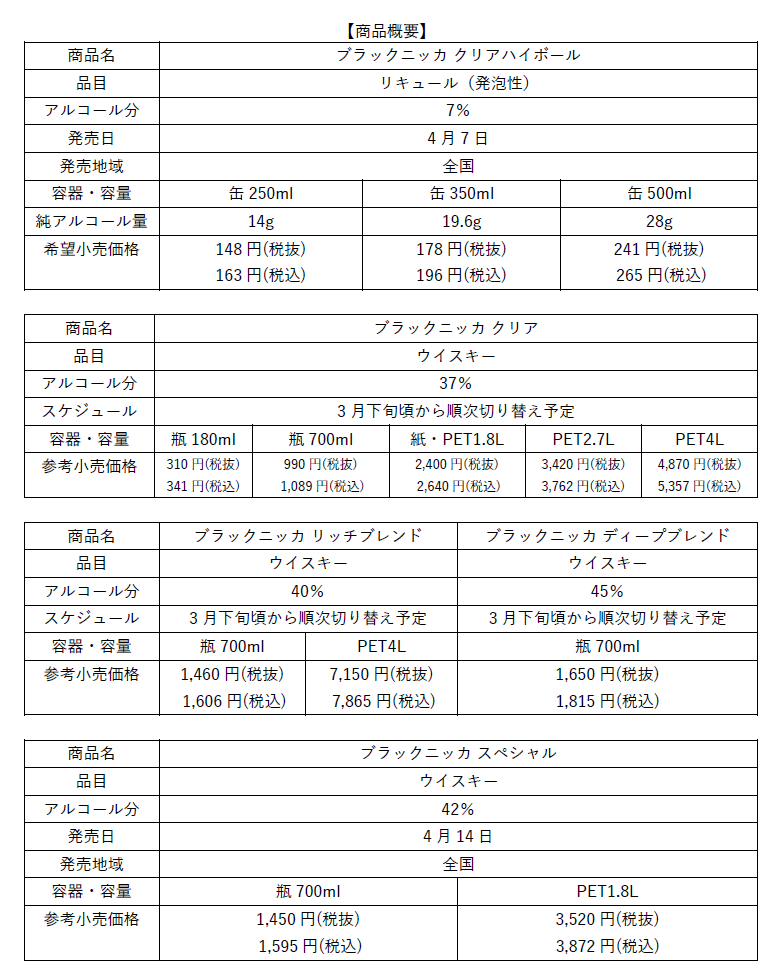 『ブラックニッカ クリア』『ブラックニッカ リッチブレンド』『ブラックニッカ ディープブレンド』は好評な中味はそのままに、3月下旬頃からパッケージを順次リニューアルする予定です。