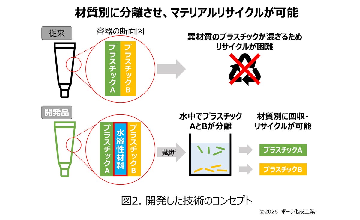 ポーラ・オルビスグループの研究・開発・生産を担うポーラ化成工業株式会社(本社:神奈川県横浜市、代表取締役社長:片桐崇行)は、異なるプラスチック材質を分離する容器技術を開発しました。三菱ケミカル株式会社(本社:東京都千代田区、代表取締役社長:筑本学)が製造する、水に溶ける特殊材料(ニチゴーGポリマーTM)を中間層に用いることで、使用済み容器を水に浸して攪拌するだけで材質ごとに分離できるという画期的なものです(図1)。これにより、高品質なリサイクル材の回収と再利用を実現し、従来困難だった積層構造容器のマテリアルリサイクルが可能となります。