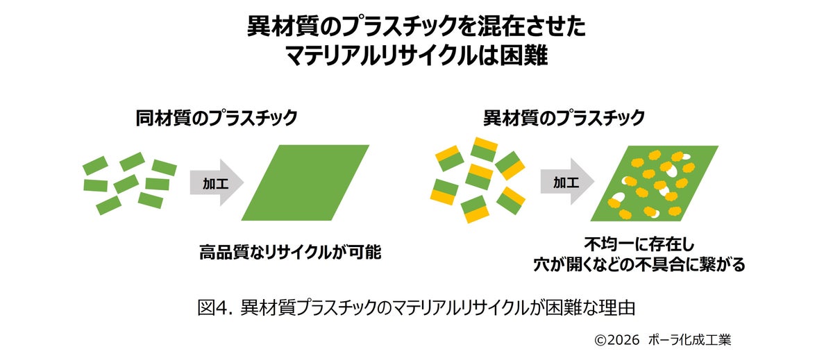 容器の種類によっては、これらの機能を兼ね備えるために、異なる特性を持つプラスチック層を貼り合わせた積層構造が採用されています。積層構造の容器は材質ごとに分離してから別々にリサイクルすると高品質なリサイクル材が得られます。一方、分離せずにマテリアルリサイクルに用いると、材質の異なるプラスチックは均一に混ざり合いにくいため、品質が著しく低下してしまいます(図4)。積層構造の容器はプラスチック層どうしを強固に接着する必要があるため、材質ごとの分離が困難で、結果として同じ製品へのリサイクルができない/用途が限定されることが課題となっていました。