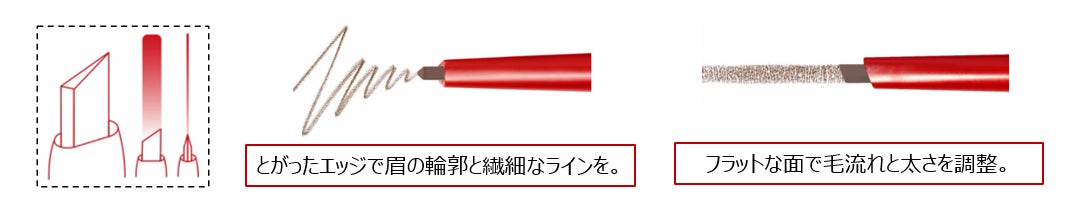 とがったエッジで眉を一本一本、繊細なラインを描き、フラットな面で毛流れを整え太さを調節することができ、なりたい印象に合わせて自由自在にコントロールすることが可能。