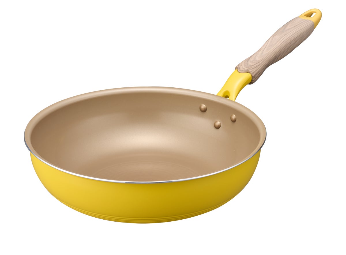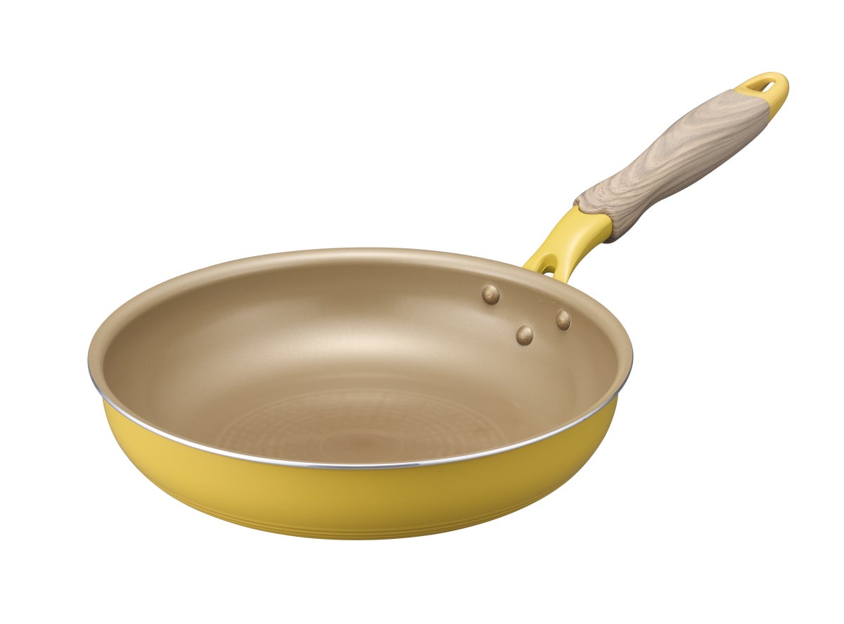 春らしく明るい印象を受けるイエローの中でも、ややグレーを加え落ち着いた色味の「メロウイエロー」を採用しました。ハンドルにはナチュラルな木目転写を施し、陽だまりのようなやさしい印象のフライパンを目指しました。外面塗装のマットな質感と、フライパン下部に施したラインも相まって、主張しすぎない存在感が見慣れたいつものキッチンをパッと明るくしてくれます。