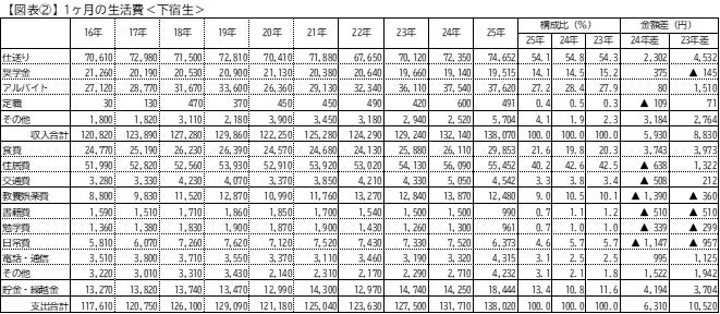 収入合計は過去10年間で最高だった。仕送りが収入の過半を占めており伸長幅も大きかった。アルバイト収入は高水準で安定、前年差は小さかった。