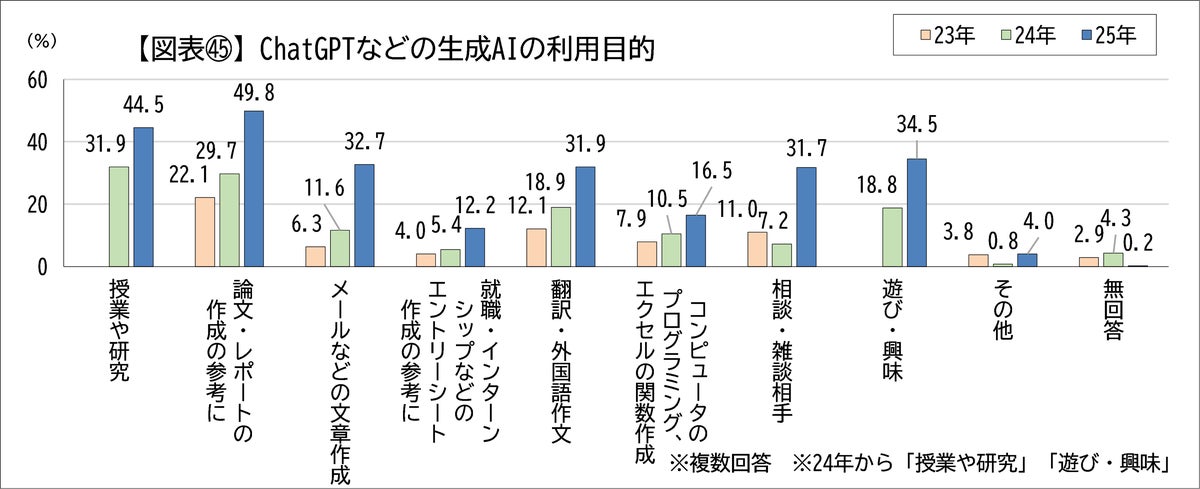 生成AIの利用は、2023年から2025年にかけて急速に広がり、2025年には利用経験者が9割を超えた。関心段階から実際の利用段階への移行が進んでいることがうかがえる。生成AIの利用目的は、授業・研究やレポート作成など学修関連が中心であり、翻訳や相談相手など補助的・日常的な用途にも広がっている。