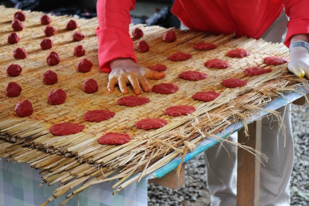 最上川流域では、最上川水系の肥沃な土地や豊富な水資源、霧の発生しやすい地形を活用することで、輪作と環境負荷の少ない方法で紅花を栽培し、その花びらを「紅餅」に加工する技術を継承してきました。現在も、地域の染色・観光・食品関連の事業者と連携して地域経済に貢献するとともに、紅花栽培を通じて荒廃しがちな中山間の農地を保全しています。