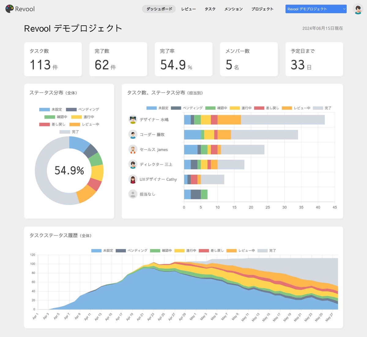 Revoolのダッシュボードでは、プロジェクト全体のタスク数やタスク完了率に加え、担当者別のタスク数からステータス分布が一目でわかります。