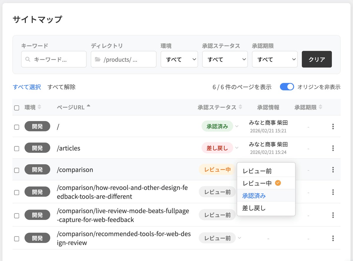 プロジェクトの全ページをRevool上に一括登録。制作チームは、社内ステータスでページ制作の進捗を管理し、「承認依頼中」ステータスにすることで、クライアントは承認作業を始められます。